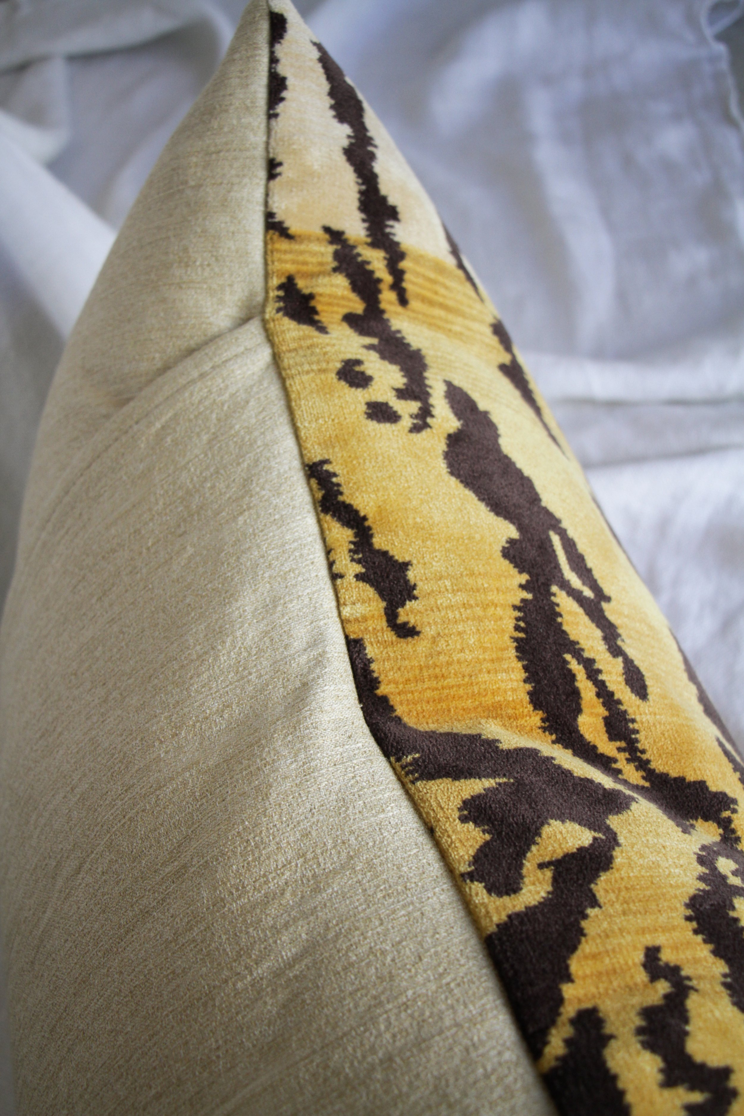 This pillow is crafted from vintage carpet in a blush and brown design. The design is featured on the front and complimented by a linen backing.
